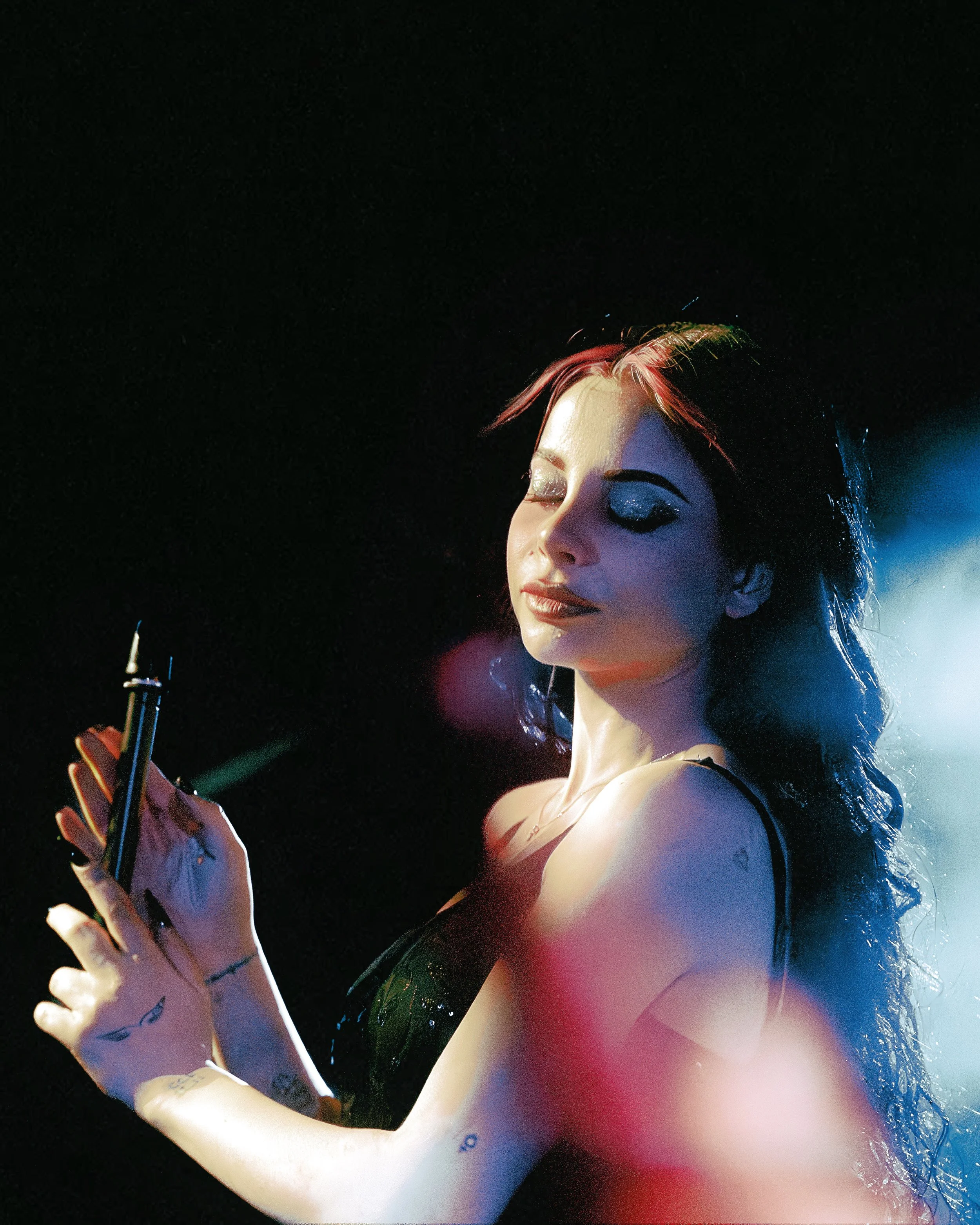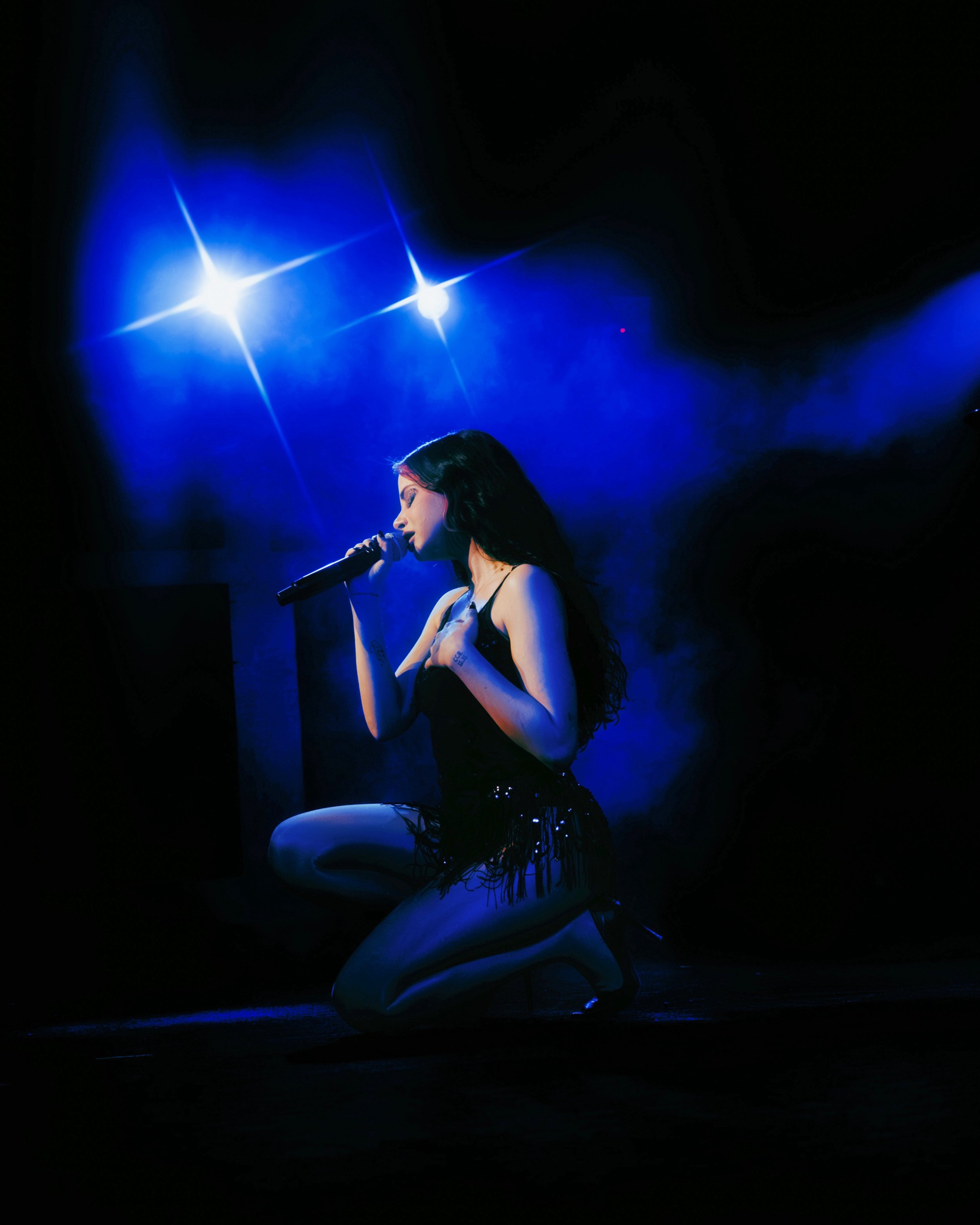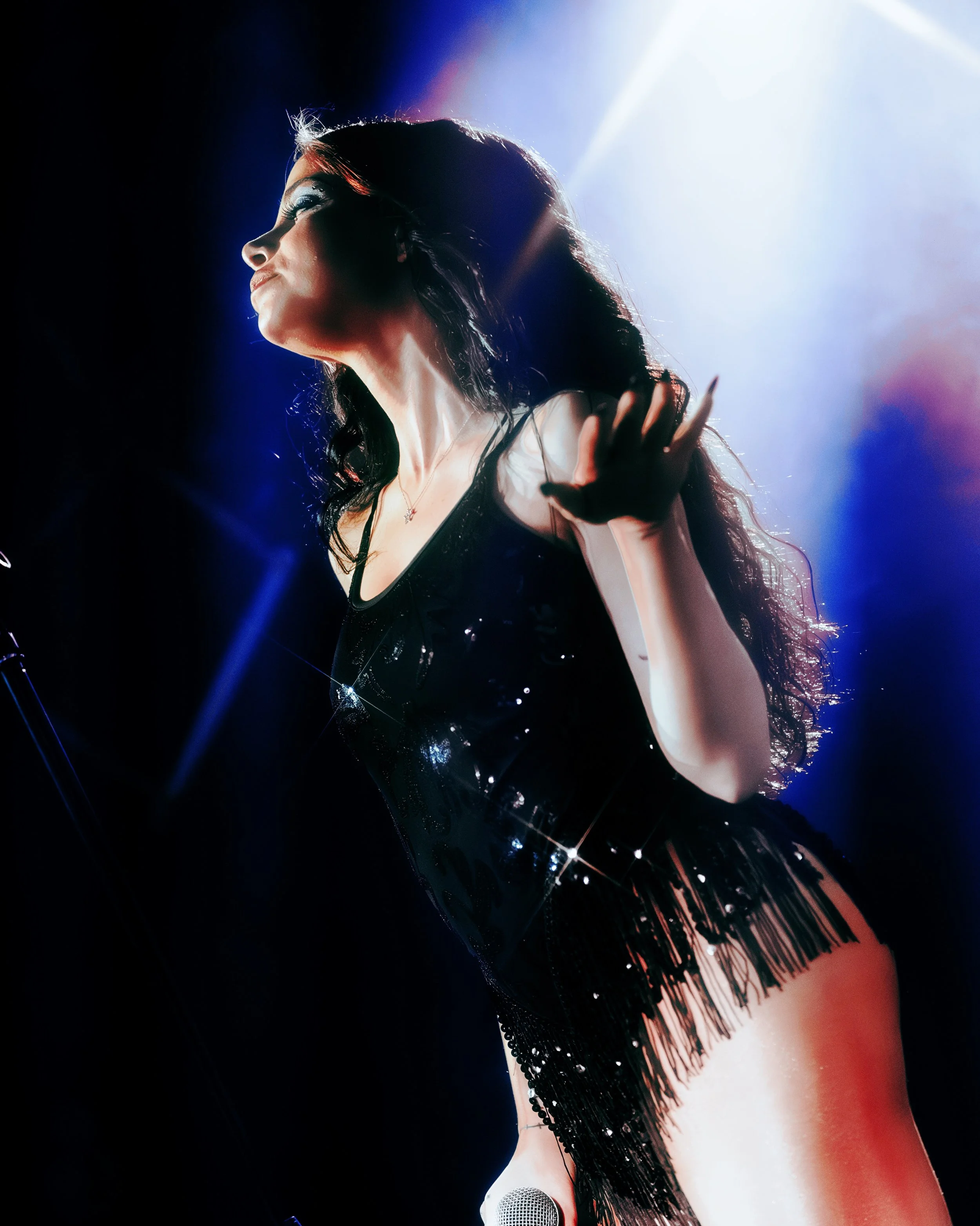 On February 10, Ellise brought that world to life at The Rebel Lounge for her Pretty Evil Tour. Bathed in deep blue lighting Ellise appeared in the drifting haze. Almost statuesque, and entirely striking to all anticipation. The artist knelt center stage, microphone in hand. Silhouetted against sharp beams of cool light. Dressed in a black, fringe-detailed performance look that shimmered subtly as she moved with long dark waves that cascaded down her back. There’s such an effortless captivation to Ellise’s air. She embodied the dark glamour that vibrates within her music. The lighting design cut electric blues through shadows making the beginning of her set sensual with a nocturnal tone. We were hooked.